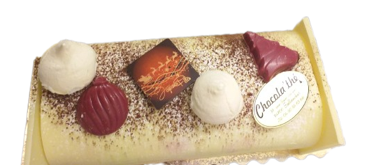 génoise, mousse chocolat blanc, chantilly, framboises.